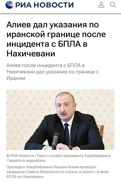 Publika.az xəbər verir ki, Rusiya mətbuatı Azərbaycan Prezidenti İlham Əliyevin Naxçıvana dron hücumunu terror aktı adlandırdığını və günahkarların məsuliyyətə cəlb edilməli olduğunu bildirdiyini yazır. Qeyd olunur ki, Təhlükəsizlik Şurasının iclasında dövlət başçısı rəsmi üzr istəməsini tələb edib və orduya cavab tədbirləri hazırlamağı tapşırıb.