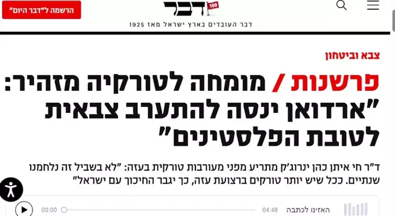 Publika.az xəbər verir ki, nəşrə danışan Tel-Əviv Universitetinin Türkiyə üzrə eksperti Hay Eytan Cohen Yanarocak, Türkiyənin Qəzzaya hərbi müdaxilə ehtimalının İsrail üçün “qırmızı xətt” olduğunu bildirib: