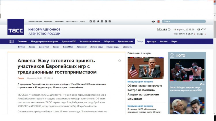 Moskvada səfərdə olan Heydər Əliyev Fondunun prezidenti Mehriban Əliyeva Rusiyanın TASS agentliyinə məxsusi müsahibəsində bildirib ki, Azərbaycanda birinci Avropa Oyunlarının iştirakçıları və qonaqları üçün maksimum rahat şərait yaradılır.