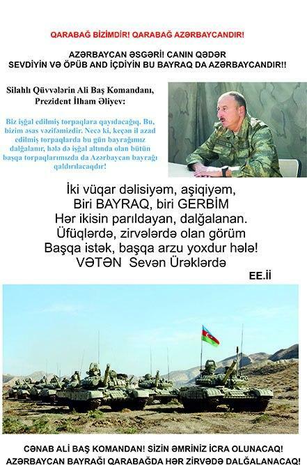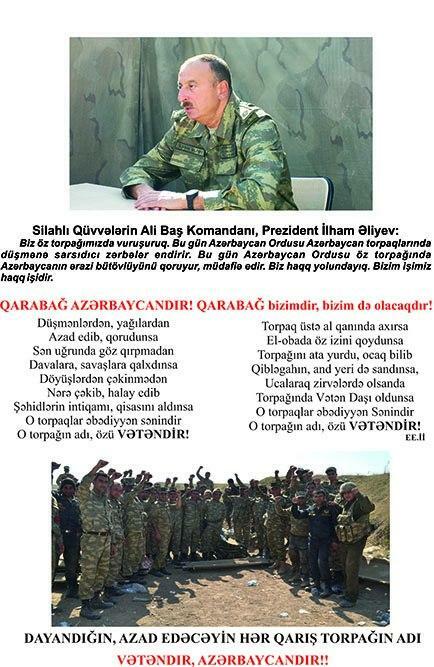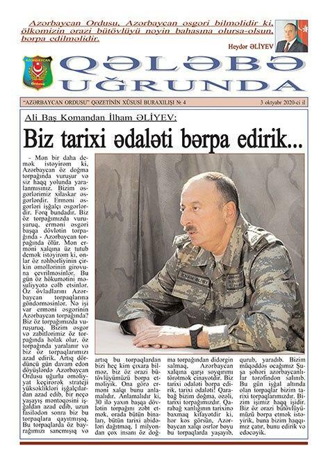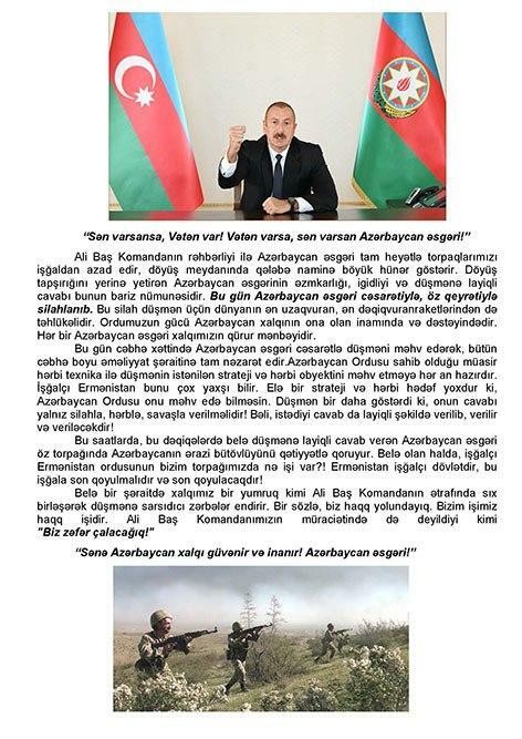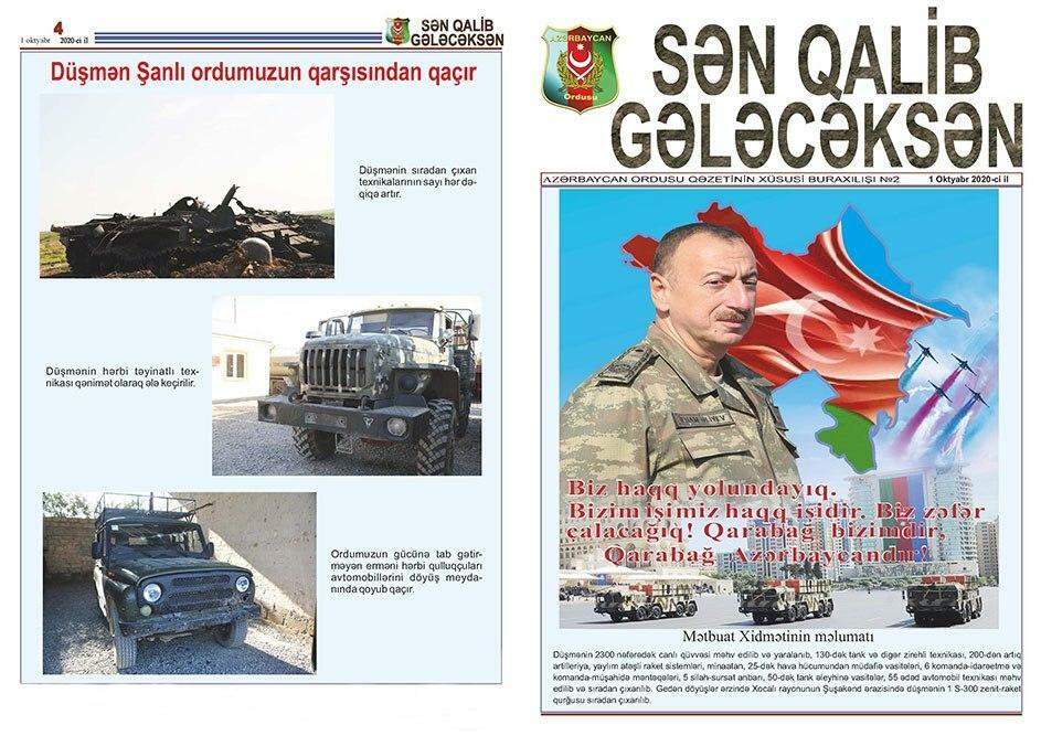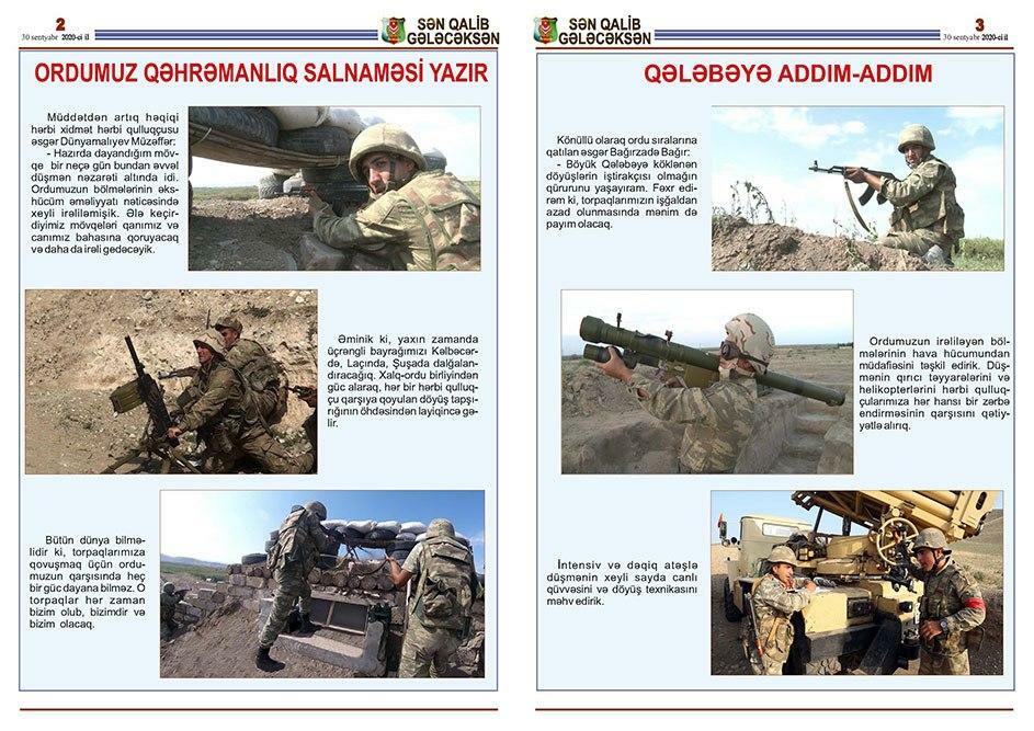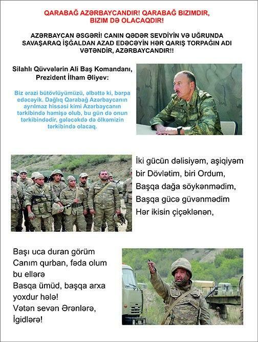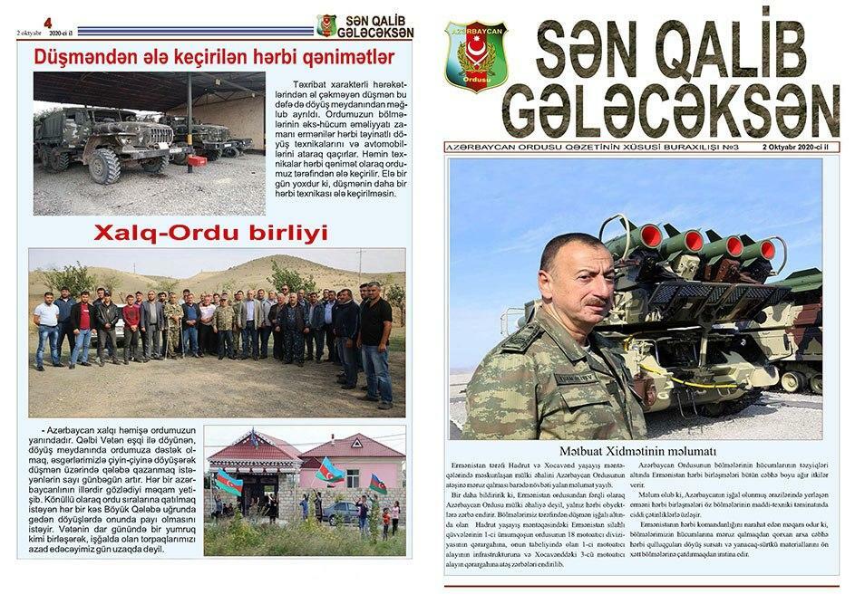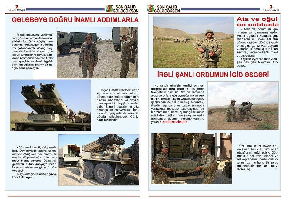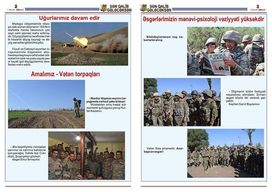 Bildirilib ki, bu günlərdə Müdafiə Nazirliyinin Hərbi Nəşriyyatının, Azərbaycan Ordusunun Sənədli və Tədris Filmləri Mərkəzinin, “Azərbaycan Ordusu” qəzeti redaksiyasının əməkdaşları döyüş bölgəsinə ezam edilib. Cəbhəboyu zonada quraşdırılan səyyar mətbəələrdə “Sən qalib gələcəksən!”, “Qalibiyyət döyüşü” və “Böyük Qələbə uğrunda” təşviqat vərəqələri, “Azərbaycan Ordusu” qəzetinin xüsusi buraxılışları, bukletlər hazırlanır cəbhədə olan şəxsi heyət və cəbhəboyu zonada yerləşən yaşayış məntəqələrinin sakinləri arasında yayılır.