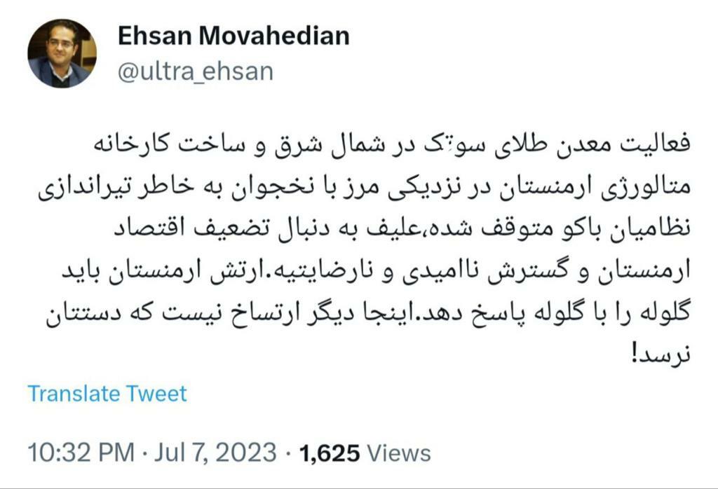 Ermənipərəst politoloq Ehsan Movəhhediyan sosial media hesabında Azərbaycana qarşı növbəti təxribat xarakterli açıqlama verib.