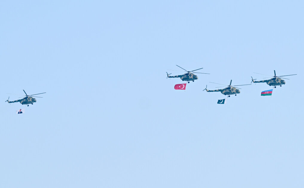 Azərbaycan, Türkiyə və Pakistan respublikalarının Dövlət bayraqlarını daşıyan "Mİ-17" döyüş-nəqliyyat helikopterləri üçlüyünə Vətən Müharibəsi qəhrəmanları – Hərbi Hava Qüvvələrinin komandanı general-leytenant Namiq İslamzadə və polkovnik Rəşad Nadirov başçılıq edirdi. "Qarabağ" ordenli general-mayor Zaur Rüstəmovun başçılığı ilə "Mİ-17" helikopteri isə Ümummilli Lider Heydər Əliyevin portretini nümayiş etdirdi.