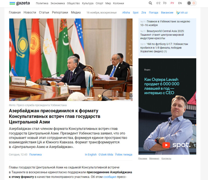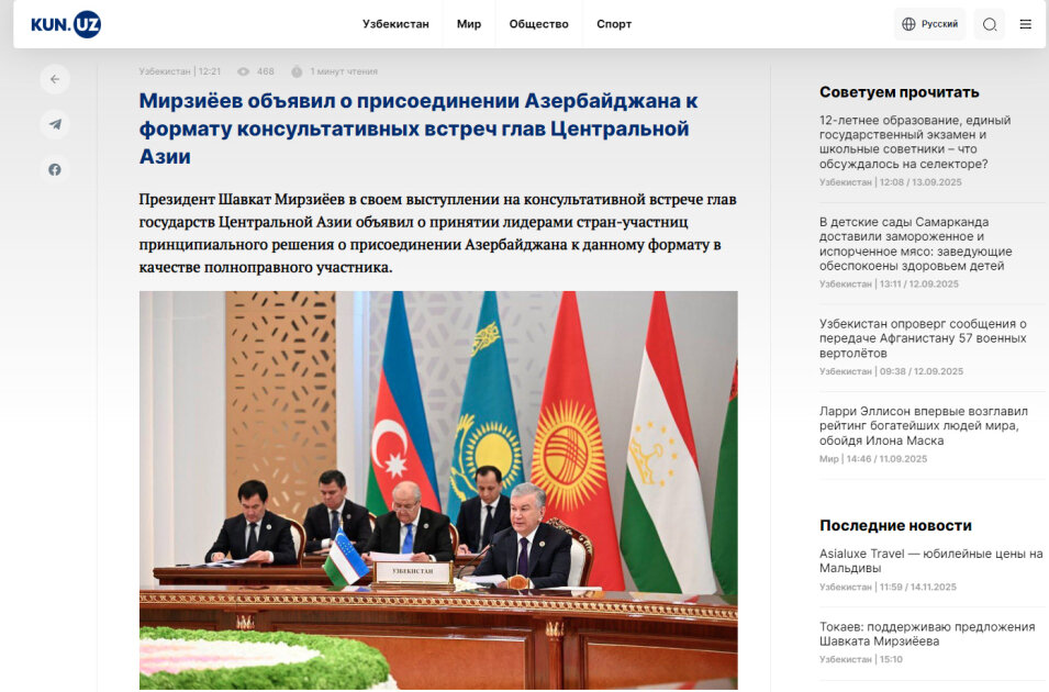 “KUN.uz” saytının materialında nəzərə çatdırılıb ki, Azərbaycan coğrafi mənada Cənubi Qafqaza aid olsa da onun Mərkəzi Asiya ilə fəal əməkdaşlıq əlaqələri vahid geosiyasi və geoiqtisadi məkanın formalaşmasına gətirib çıxarıb.