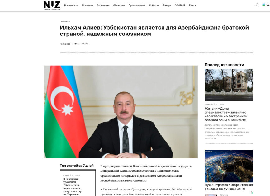 “Nuz.uz” saytı Prezident İlham Əliyevin “Özbəkistan Azərbaycan üçün qardaş ölkə və etibarlı müttəfiqdir” sözlərini manşetə çıxararaq yazır ki, Mərkəzi Asiya və Azərbaycan vahid mədəni, coğrafi və geosiyasi məkan formalaşdırır. Materialda Prezident İlham Əliyevin fikrinə bir daha istinad olunur və diqqətə çatdırılır ki, əslində Xəzər dənizi Azərbaycan ilə Mərkəzi Asiyanı ayırmır, əksinə birləşdirir.