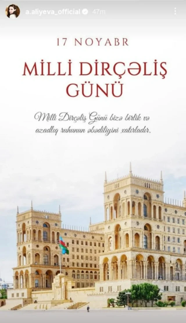 Prezident İlham Əliyevin gəlini Alyona Əliyeva 17 Noyabr - Milli Dirçəliş Günü ilə bağlı paylaşım edib.