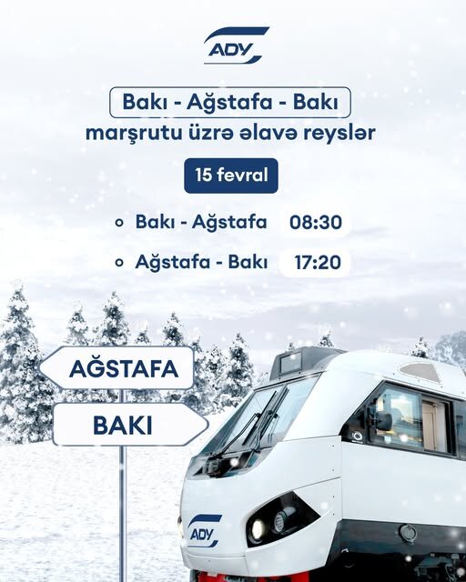 "Azərbaycan Dəmir Yolları" QSC (ADY) artan sərnişin tələbatını təmin etmək məqsədilə 15 fevral tarixində Bakı-Ağstafa-Bakı istiqamətində əlavə qatar reysləri təyin edir.
