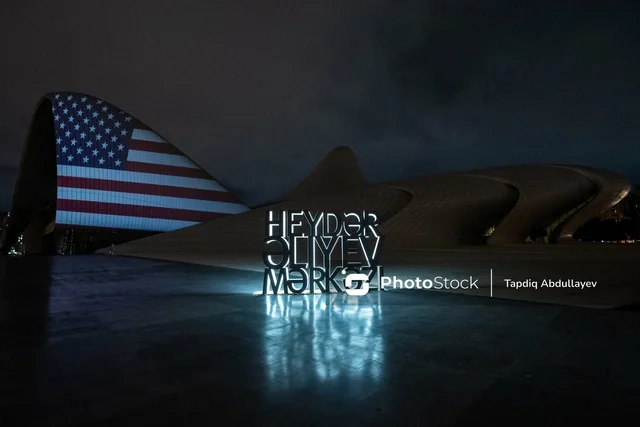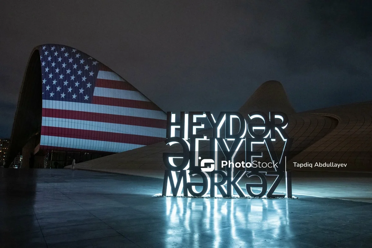 Heydər Əliyev Mərkəzinin binası Amerika Birləşmiş Ştatlarının dövlət bayrağı ilə işıqlandırılıb.