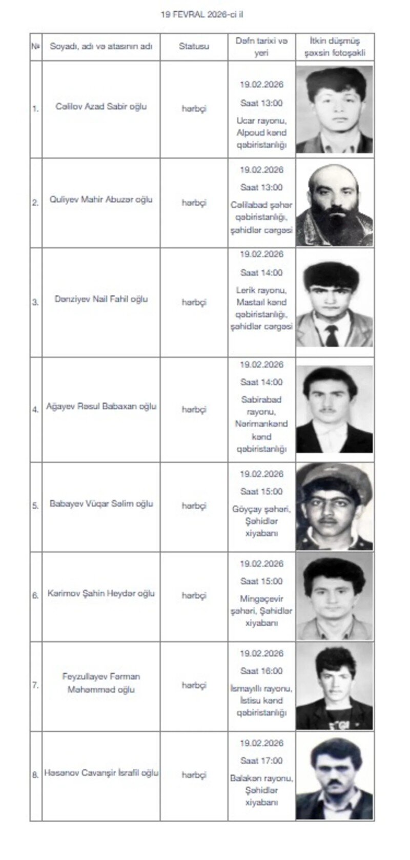 İtkin-şəhidlərin bir qismi fevralın 19-da, digər qismi isə fevralın 20-də dəfn olunacaq.