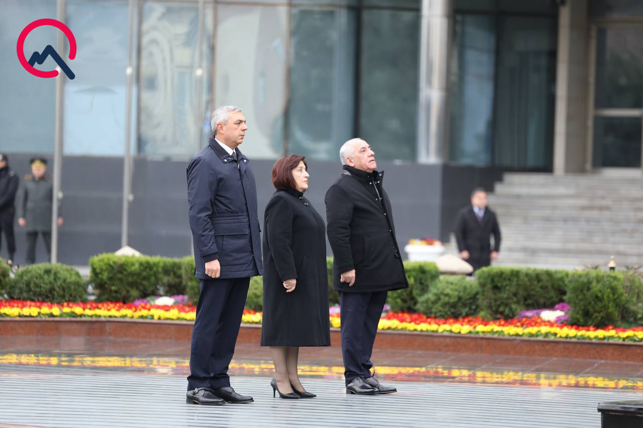 Rəsmilər Xocalı soyqırımı abidəsi önünə gül dəstələri düzüblər.(“Qafqazinfo”)