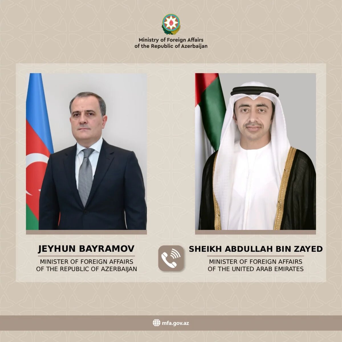 6 mart tarixində Birləşmiş Ərəb Əmirliklərinin Baş nazirinin müavini və xarici işlər naziri Şeyx Abdullah bin Zayed Əl Nəhyan Azərbaycanın xarici işlər naziri Ceyhun Bayramova zəng vurub.