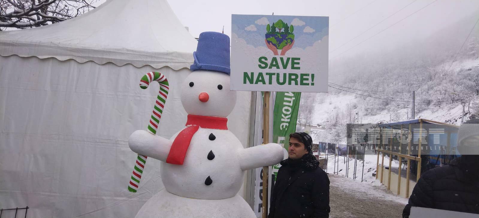 Aksiya iştirakçıları "Qar adamı"nın yanında üzərində Azərbaycan, rus və ingilis dillərində yazılmış plakatlar qaldırıb, şüarlar səsləndirirlər.