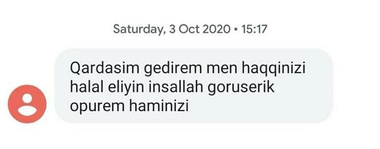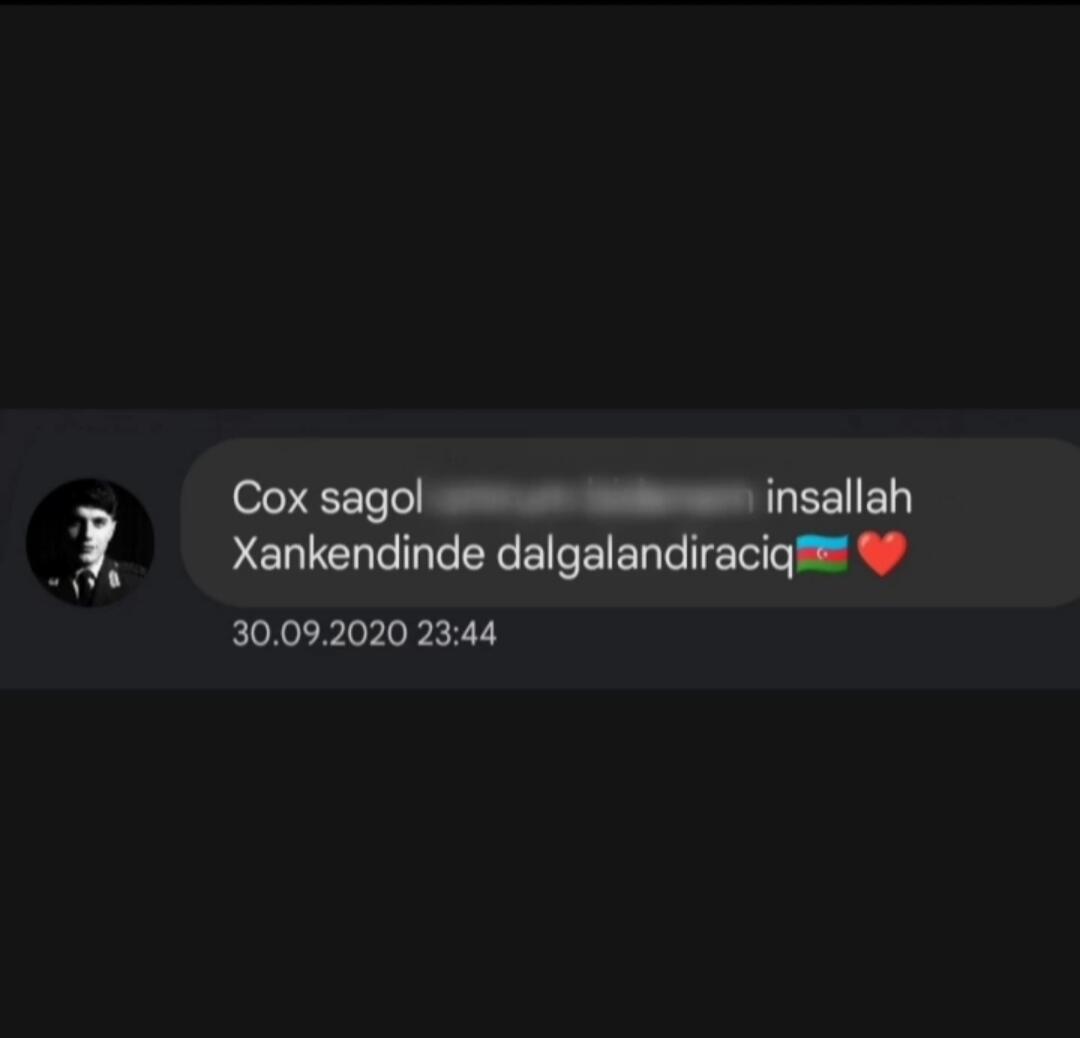 “Hər gün danışırdıq. Getdiyini heç bilmirdim. Şəhid olduğu gün, oktyabrın 11-də, səhər saat 7 radələrində qardaşına yazıb ki, “Qardaşım, mən gedirəm, haqqınızı halal edin”.