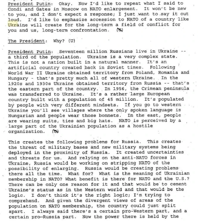 6 aprel 2008-ci ilə aid olan ikinci söhbətdə Putin Buşa deyib ki, Ukrayna “parçalanmış cəmiyyətə malik süni dövlətdir” və bu ölkənin NATO-ya qəbul edilməsi Qərblə uzunmüddətli qarşıdurmaya səbəb ola bilər.
