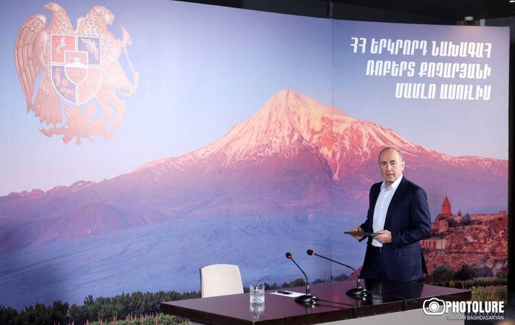 Publika.az xəbər verir ki, Köçəryanın mətbuat konfransında başqa bir detal da diqqəti cəlb edib. Xocalı qatili Ağrı dağının yer aldığı portretin fonunda jurnalistlərlə söhbətləşib.