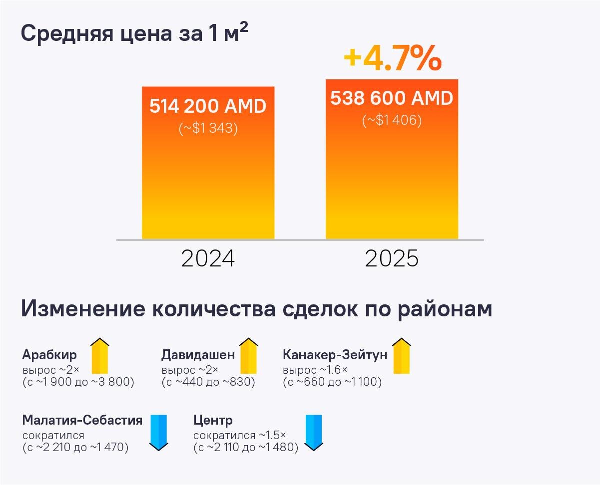 Rayonlardakı qiymətlərə gəldikdə, Mərkəzi və Ərəbkirdə (paytaxtda ən bahalı) qiymətlər cüzi (təxminən 1-2%) azalıb. Bu, tələbatın əhəmiyyətli dərəcədə azaldığını göstərmir, xüsusən də mütləq baxımdan bu iki rayondakı mənzillər digər rayonlara nisbətən daha bahadır. Mərkəzdə orta qiymət kvadrat metr üçün 892.900 dram (3962 manat), Ərəbkirdə isə 626.200 dram (2779 manat) olub.