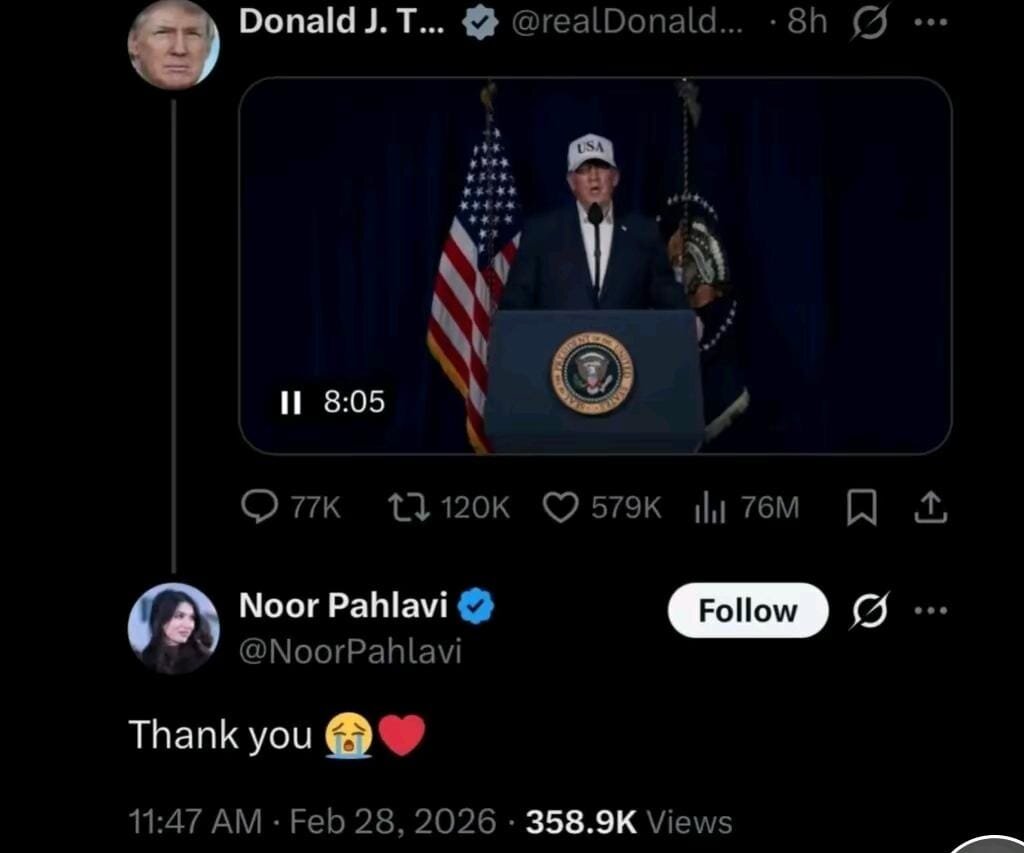 Publika.az xəbər verir ki, Nur Pəhləvi ABŞ prezidenti Donald Trampın rəsmi "X" hesabında İranın ali dini lideri Əli Xameneinin öldürülməsi ilə bağlı paylaşdığı məlumatın altına “Çox sağ ol!” (“Thank you!”) şərhini yazıb. Qısa, lakin son dərəcə siyasi məna daşıyan bu mesaj qısa müddətdə geniş rezonans yaradıb.