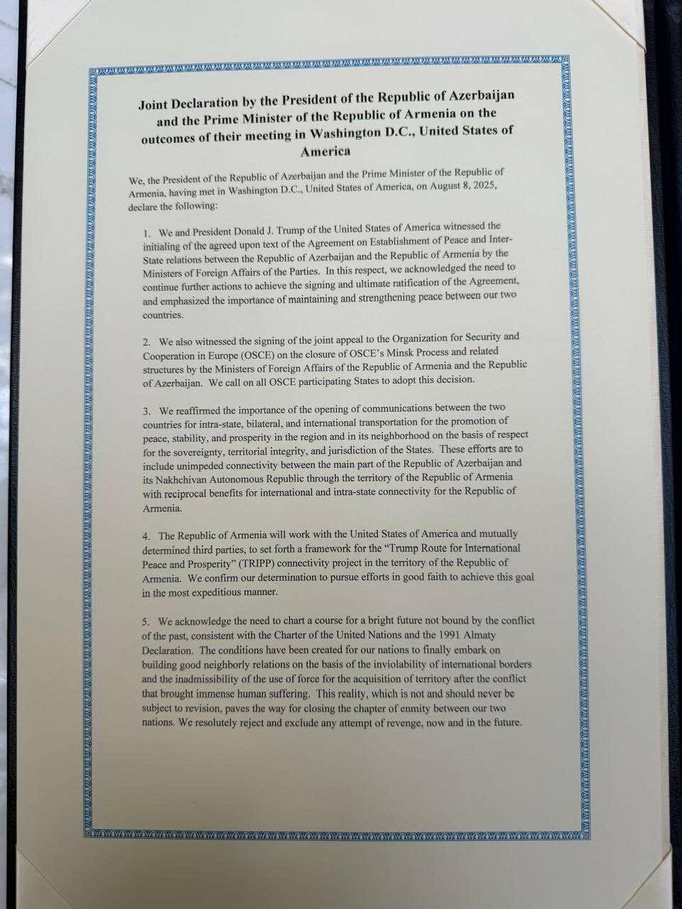 "Biz, Azərbaycan Respublikasının Prezidenti və Ermənistan Respublikasının Baş Naziri 8 avqust 2025-ci il tarixində Amerika Birləşmiş Ştatlarının Vaşinqton şəhərində görüşərək, aşağıdakıları bəyan edirik: