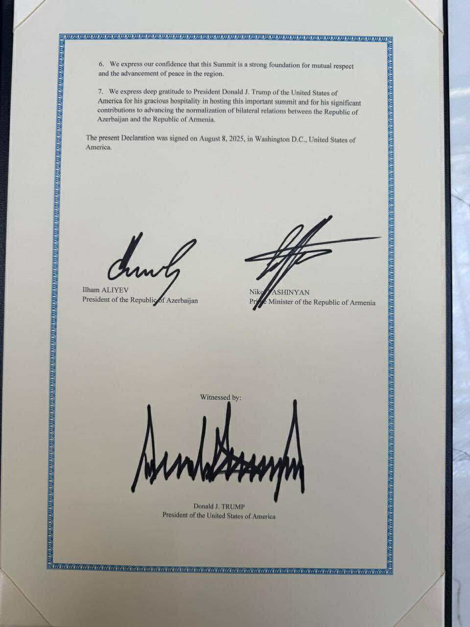 Bu Bəyannamə 8 avqust 2025-ci il tarixində Amerika Birləşmiş Ştatlarının Vaşinqton şəhərində imzalanıb".