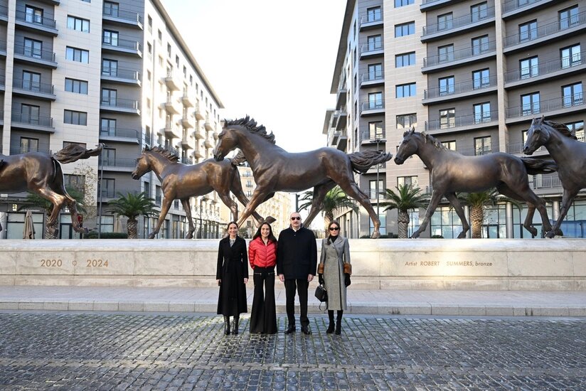Prezident İlham Əliyev, birinci xanım Mehriban Əliyeva və qızları əvvəlcə "Qarabağ atları" heykəltaraşlıq kompleksi ilə tanış olublar. Vətən müharibəsindəki Qələbəmizə həsr edilmiş və milli irsimizin rəmzi olan bu kompleks "Qarabağ atları" meydanında ucaldılıb. Kompleksdə "Soltan", "Ürək", "Sereyin", "Aypara", "Şöhrət", "Ötqəm" və "İldırım" adlı ümumilikdə 7 Qarabağ atının heykəli var.