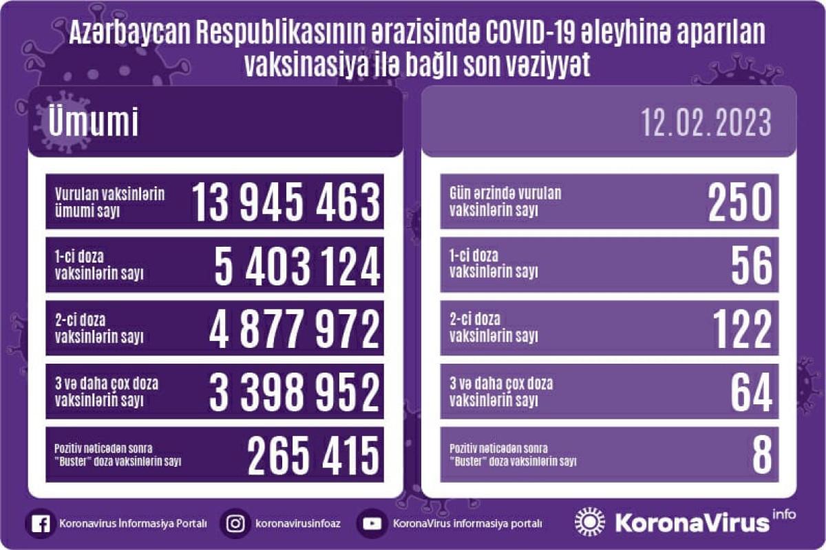 Azərbaycanda son sutkada koronavirus (COVID-19) əleyhinə 250 vaksin vurulub.