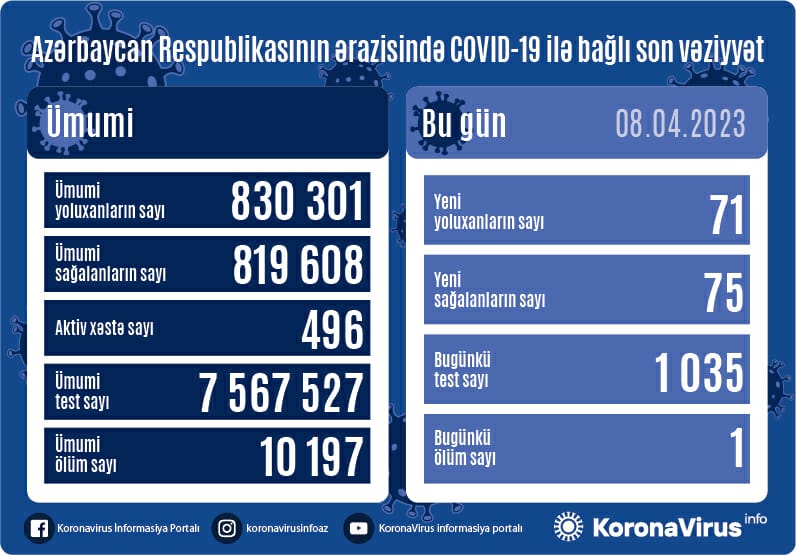 Azərbaycanda son sutkada koronavirus infeksiyasına 71 yeni yoluxma faktı qeydə alınıb, 75 nəfər müalicə olunaraq sağalıb.