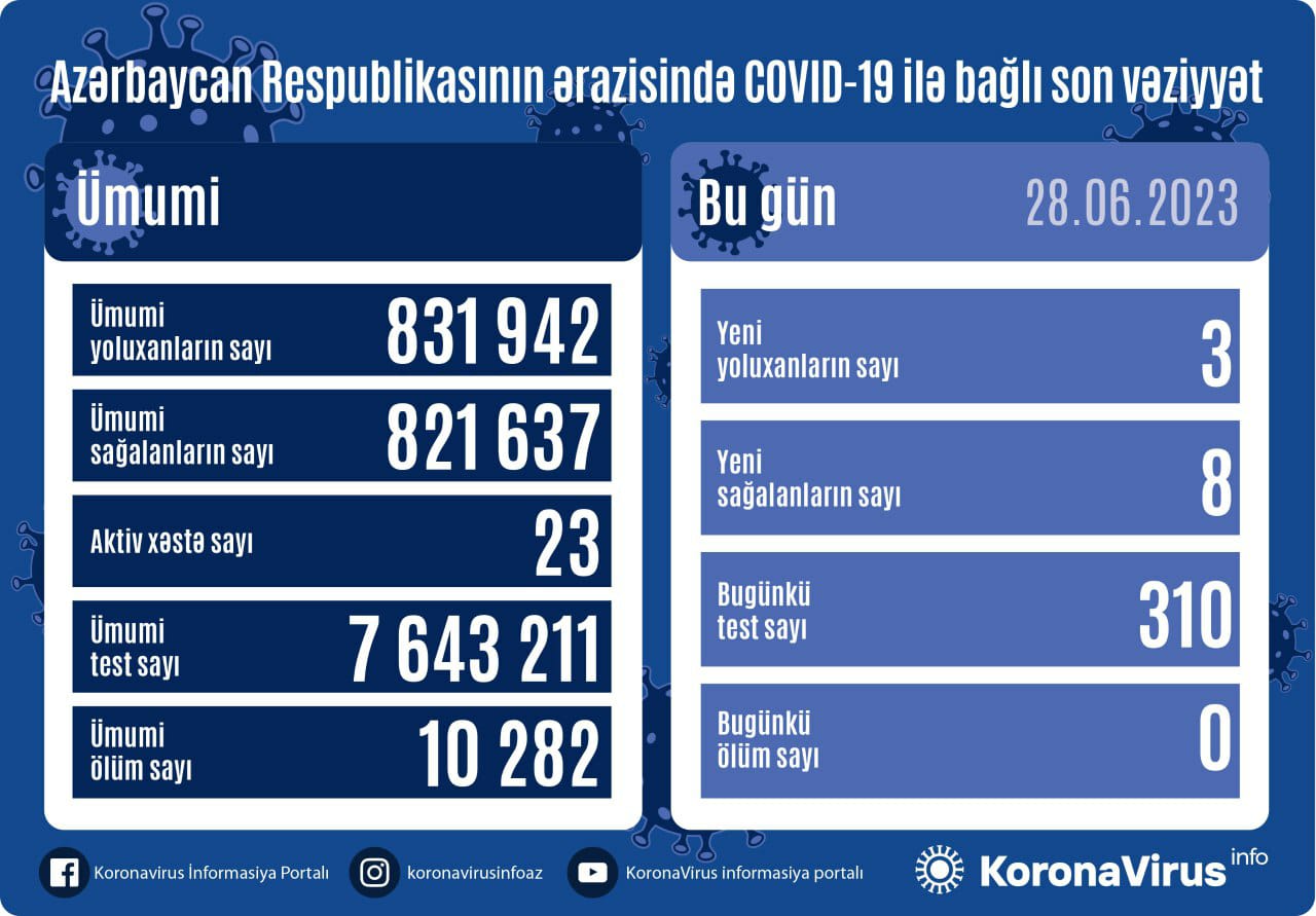 Azərbaycanda son sutkada koronavirus infeksiyasına 3 yeni yoluxma faktı qeydə alınıb, 8 nəfər müalicə alaraq sağalıb.