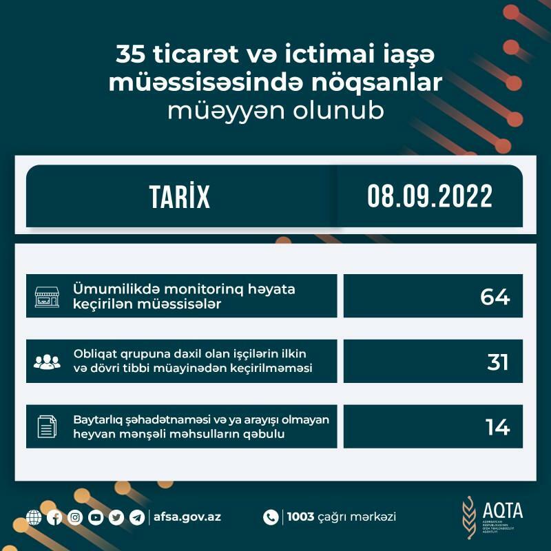 Sentyabrın 8-də Qida Təhlükəsizliyi Agentliyinin (AQTA) əməkdaşları tərəfindən respublika ərazisində qida sahəsində fəaliyyət göstərən 39 ticarət müəssisəsi və 25 ictimai iaşə müəssisəsində həyata keçirilən monitorinqlər zamanı ümumilikdə 35 müəssisədə nöqsanlar müəyyən olunub.