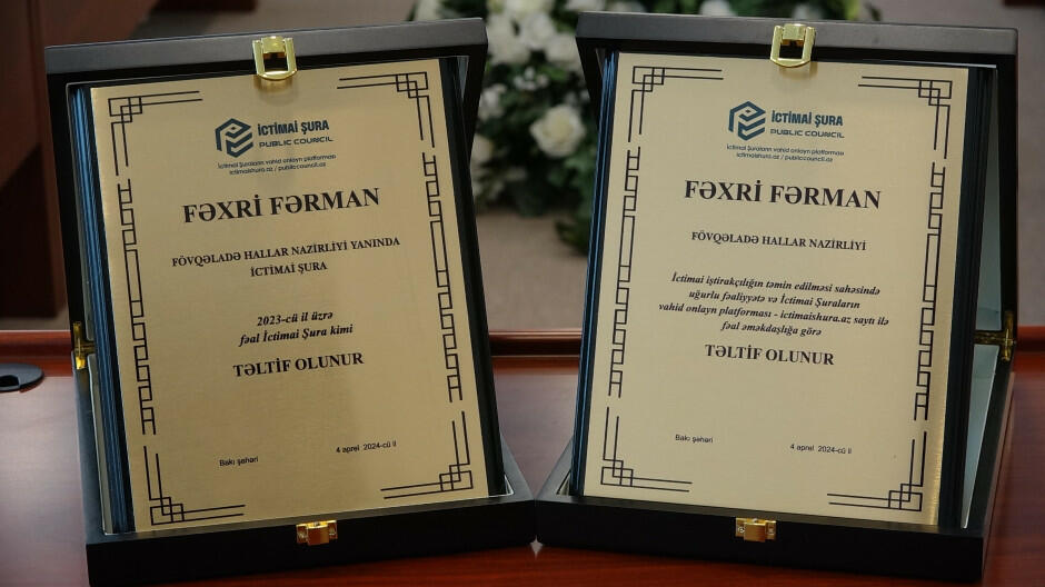 Bütün qeyd olunanlar nəzərə alınaraq, İctimai şuraların vahid onlayn plaforması tərəfindən Fövqəladə Hallar Nazirliyi ictimai iştirakçılığın təmin edilməsində və ictimai şuraların vahid onlayn platforması olan ictimaishura.az saytı ilə fəal əməkdaşlığına görə, Nazirlik yanında İctimai şura isə 2023-cü il üzrə ən fəal İctimai şura kimi Fəxri Fərmanla təltif edilib.