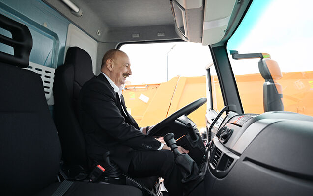 Publika.az xəbər verir ki, dövlət başçısı “IVECO” markalı yük və xüsusi təyinatlı avtomobillərdən birinin sükanı arxasına keçib.
