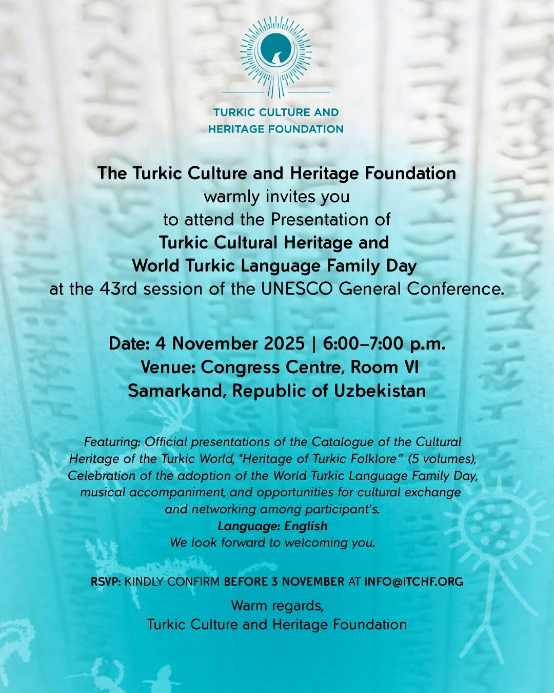 4 noyabr 2025-ci il tarixində, Özbəkistanın Səmərqənd şəhərində keçirilən YUNESKO-nun Baş Konfransının 43-cü sessiyası çərçivəsində Türk dünyası üçün tarixi əhəmiyyətə malik mühüm bir hadisə baş tutacaq — Türk Mədəniyyəti və İrsi Fondu ilk dəfə olaraq türk sivilizasiyasının dərinliyini və böyüklüyünü əks etdirən unikal layihələrin təqdimatını keçirəcək.