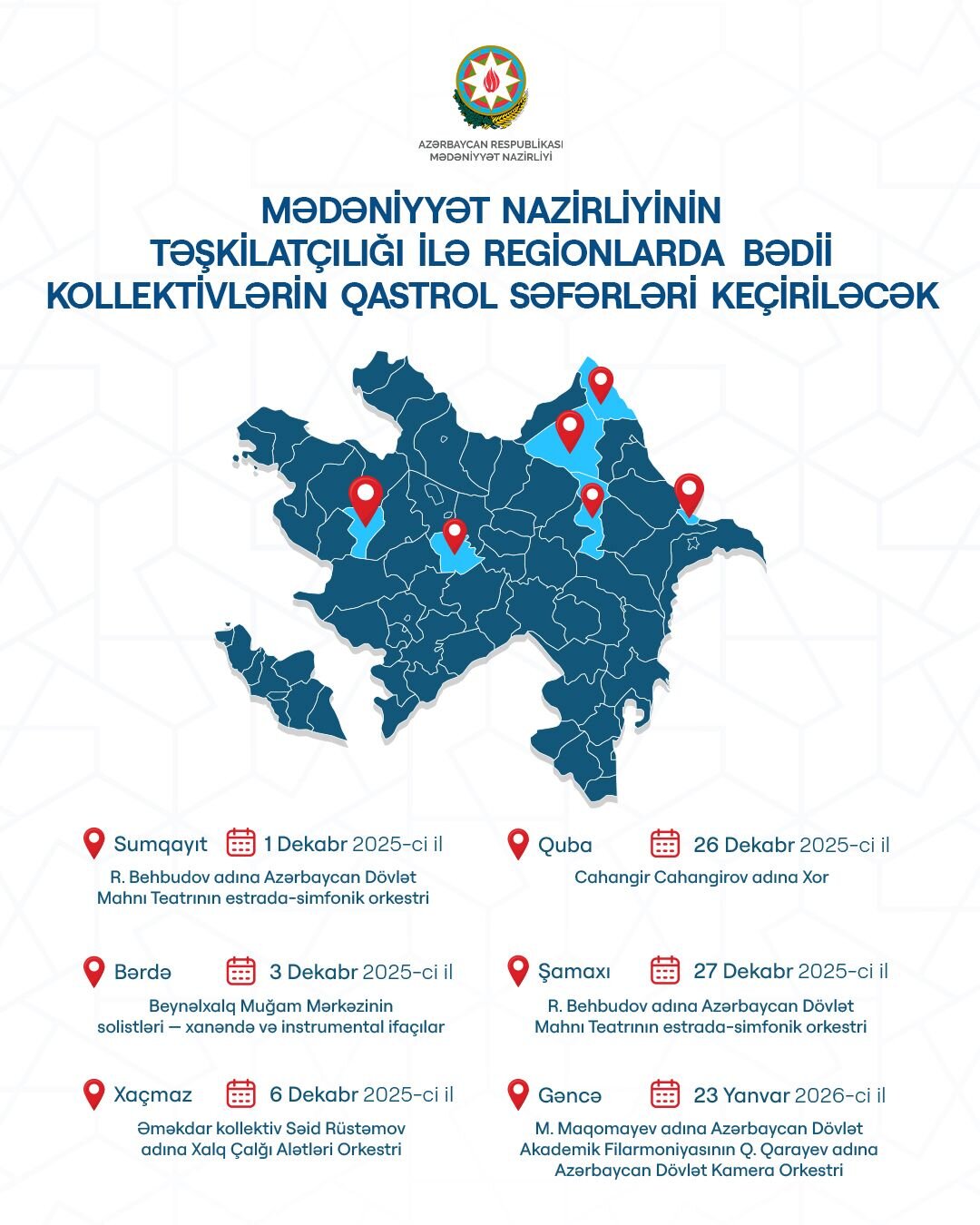 Qastrol proqramı çərçivəsində 2025-ci ildə R. Behbudov adına Azərbaycan Dövlət Mahnı Teatrının estrada-simfonik orkestrinin 1 dekabrda Sumqayıt şəhəri “Kimyaçı” Mədəniyyət Sarayında, 27 dekabrda isə Şamaxı rayon Mədəniyyət Mərkəzində, Beynəlxalq Muğam Mərkəzinin solistləri — xanəndə və instrumental ifaçılarının 3 dekabrda Bərdə rayon Mədəniyyət Mərkəzində, Əməkdar Kollektiv Səid Rüstəmov adına Xalq Çalğı Alətləri Orkestrinin 6 dekabrda Heydər Əliyev adına Xaçmaz rayon Mədəniyyət Mərkəzində, Cahangir Cahangirov adına Xor kollektivinin isə 26 dekabrda Quba rayon Mədəniyyət Mərkəzində çıxışları baş tutacaq. 2026-cı ildə isə M. Maqomayev adına Azərbaycan Dövlət Akademik Filarmoniyasının Q. Qarayev adına Azərbaycan Dövlət Kamera Orkestrinin 23 yanvarda Fikrət Əmirov adına Gəncə Dövlət Filarmoniyasında konsert proqramı ilə çıxışı nəzərdə tutulur.