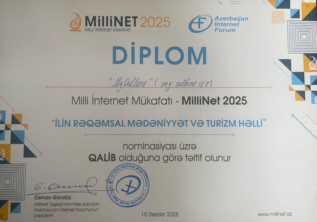 Mədəniyyət Nazirliyinin “MyCulture” Vahid Şəxsi Kabineti (https://my.culture.az) “MilliNet 2025” milli internet müsabiqəsinin “İlin rəqəmsal mədəniyyət və turizm həlli” nominasiyası üzrə qalibi seçilib.