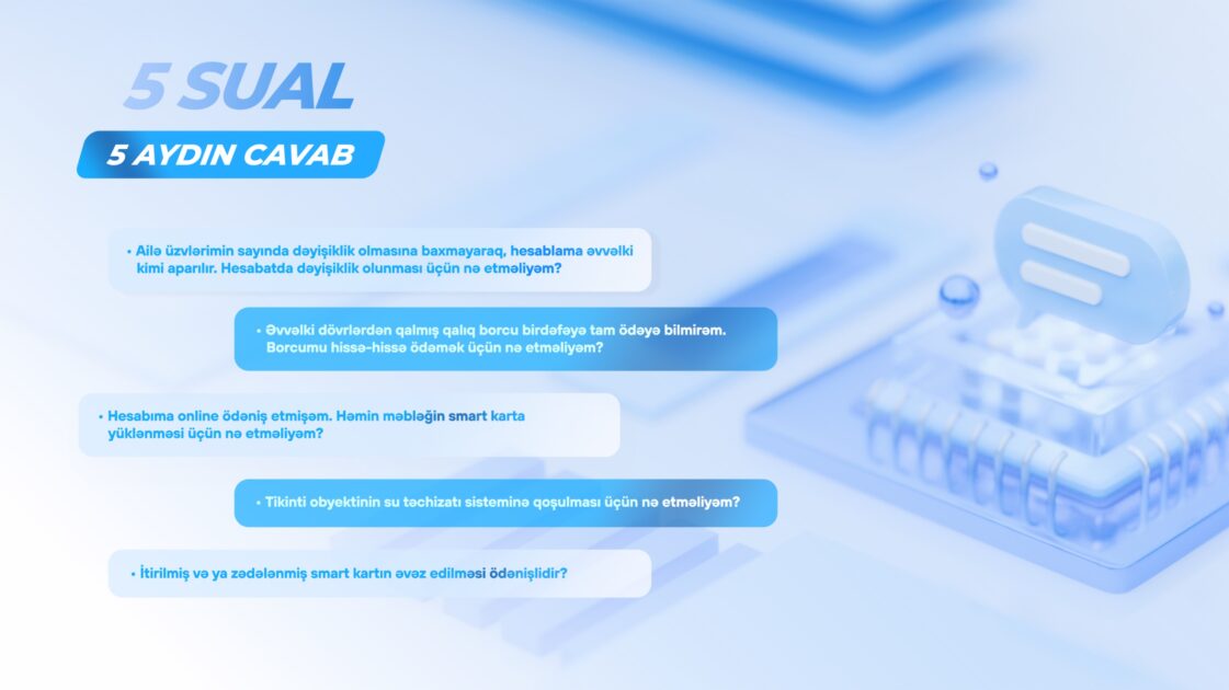Publika.az xəbər verir ki, bu kimi suallar içərisində vətəndaşların tez-tez müraciət etdikləri mövzuları əhatə edənləri də var. ADSEA-nın İri Şəhərlərin Birləşmiş Su Təchizatı Xidməti həmin sualları və onların cavablarını mərhələli şəkildə təqdim edir.