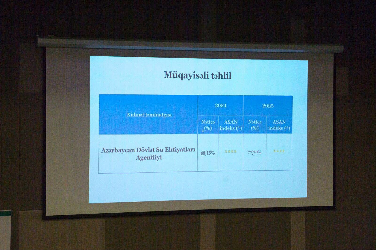Qiymətləndirmə nəticələrinə əsasən, Azərbaycan Dövlət Su Ehtiyatları Agentliyi ASAN Xidmət indeksi üzrə 77,7% nəticə ilə 2-ci yerə, İri Şəhərlərin Birləşmiş Su Təchizatı Xidməti isə “ASAN müraciət” informasiya sistemi üzrə daxil olan müraciətlərin icra vəziyyətinə görə 53,4% nəticə ilə 2-ci yerə layiq görülüb.