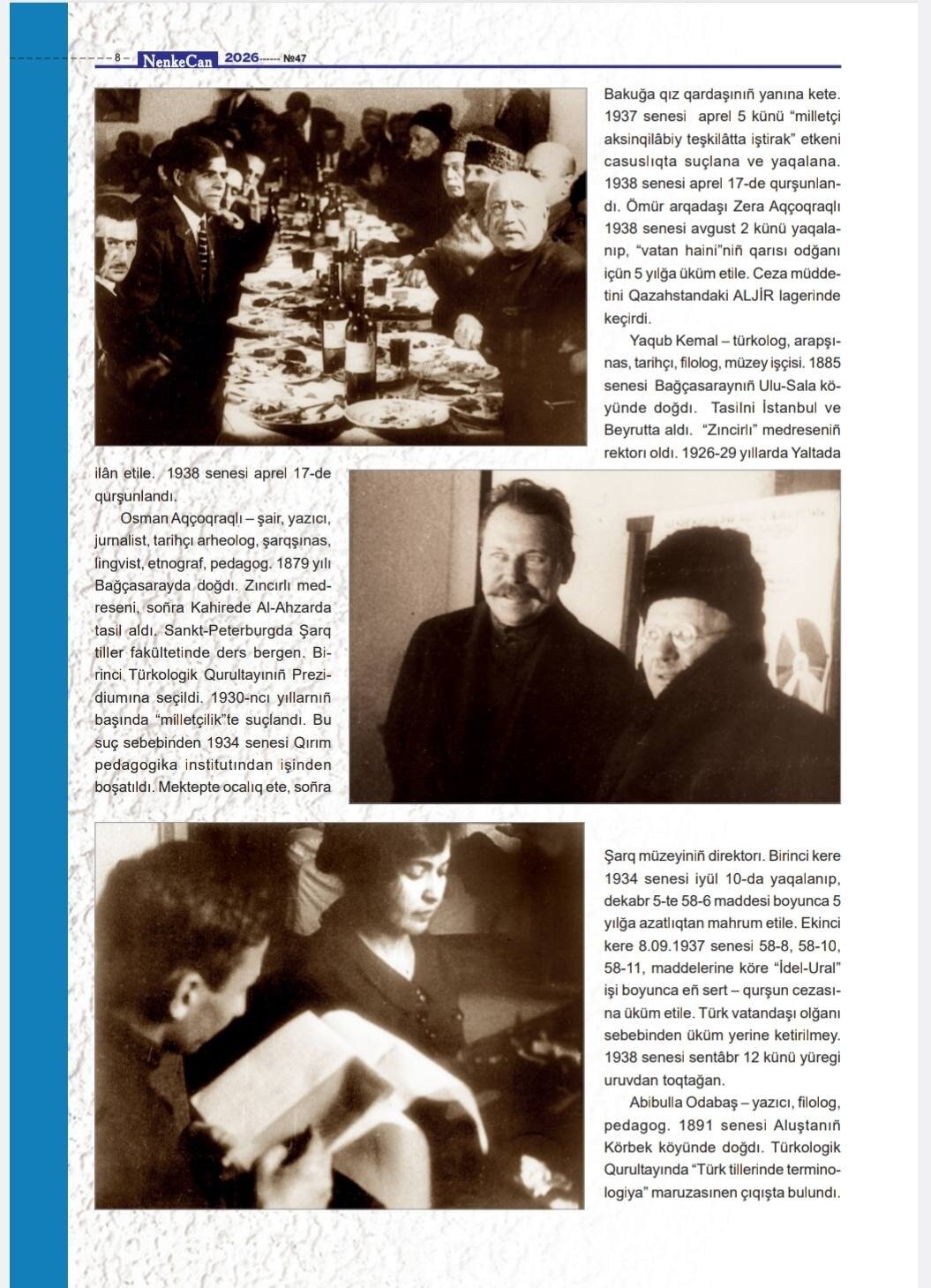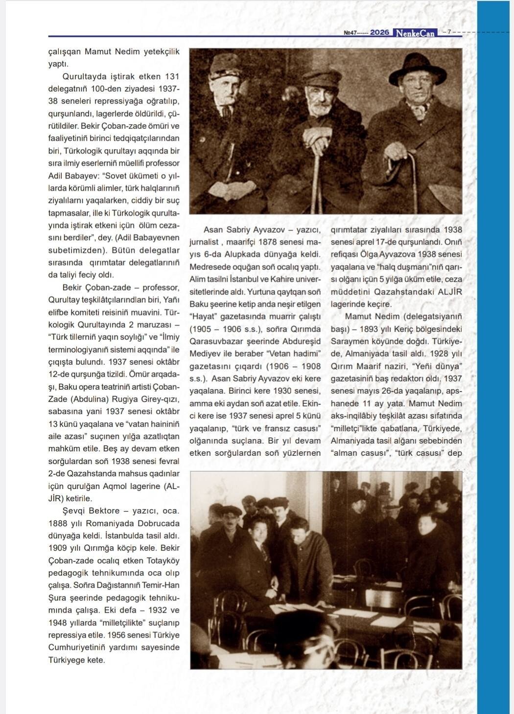 Jurnalın redaktoru və baş yazarı Zera xanım Bəkirova I Türkoloji Qurultayda Krım tatar xalqını təmsil edən 8 şəxsiyyət – Bəkir Çobanzadə, Mahmud Nedim, Həsən Səbri Ayvazov, Həbibulla Odabaşı, İsmayıl Lemanov, Osman Akçokraklı, Şövqü Bektore, Yakub Kamal haqqında ətraflı məlumat təqdim edib.