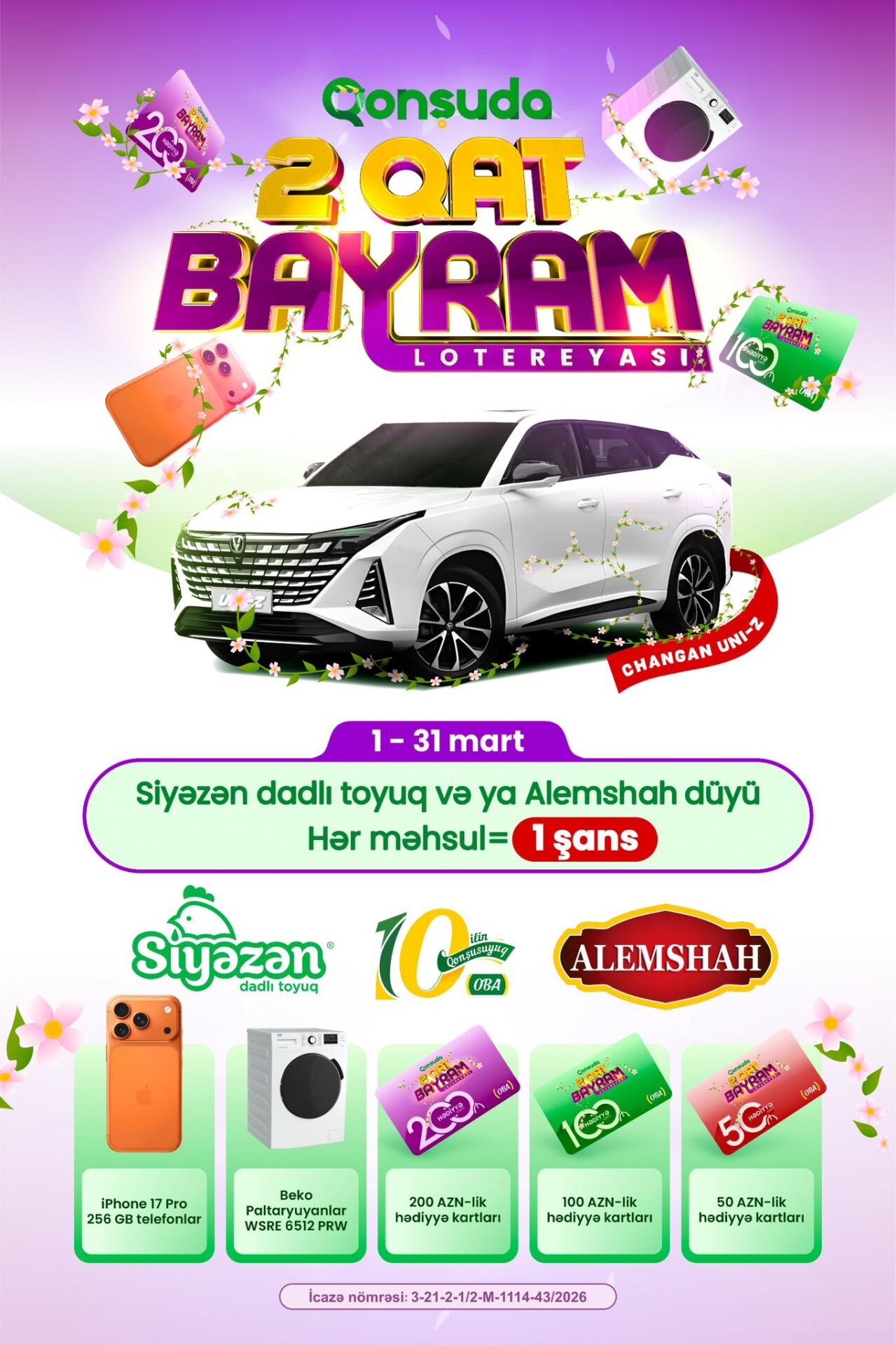 “Qonşuda 2 qat bayram” lotereyası çərçivəsində iştirakçılar üçün bir-birindən dəyərli hədiyyələr təqdim olunur. Uduşlar sırasında iPhone 17 Pro mobil telefonları, paltaryuyan maşınlar və alış-veriş kartları yer alır. Kampaniyanın final tirajında isə iştirakçılardan biri möhtəşəm əsas mükafat – Changan UNI-Z avtomobilinin sahibi olacaq.
