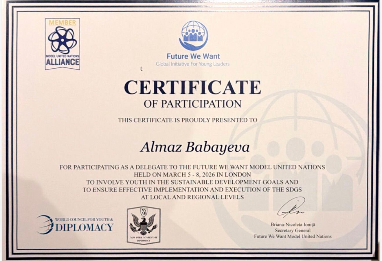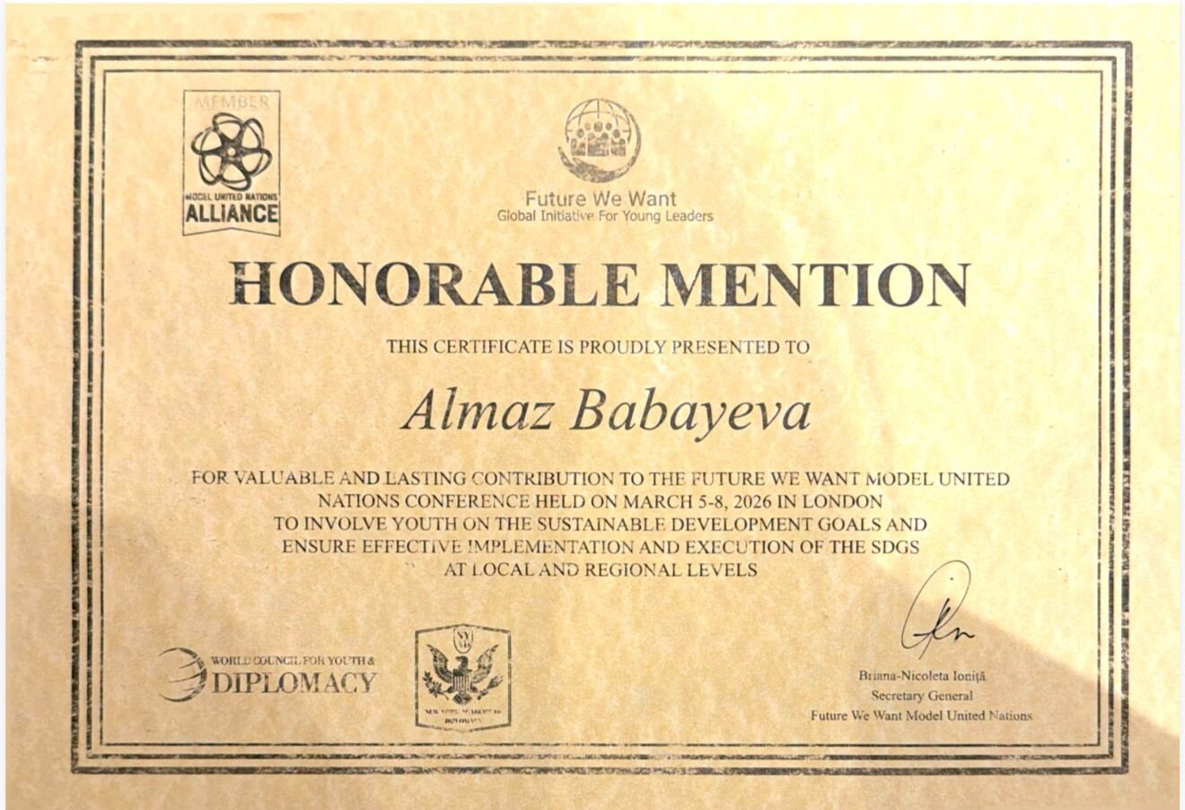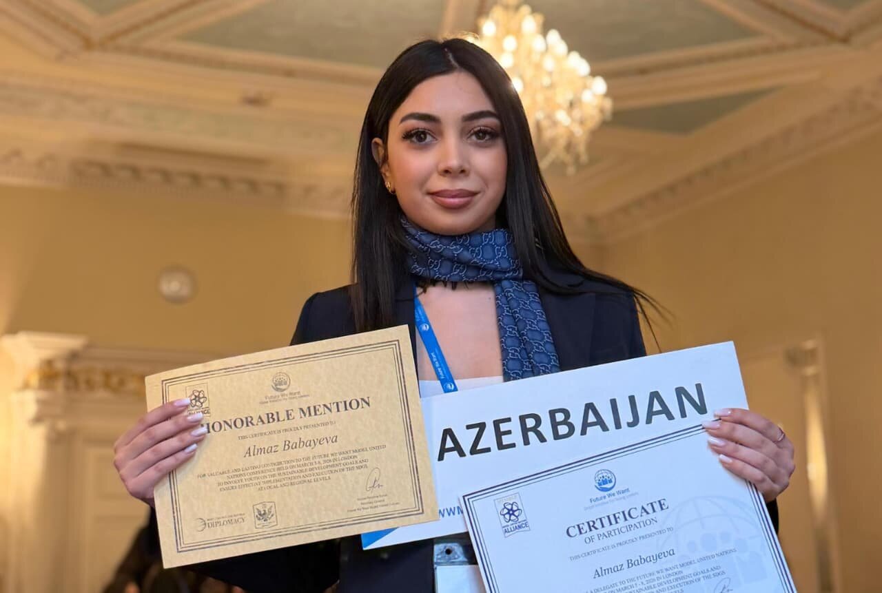 Azərbaycanlı gənc lider Almaz Babayeva Londonda keçirilən “İstədiyimiz Gələcək” (Future We Want) Model Birləşmiş Millətlər Təşkilatı (MUN) konfransında iştirak edib və göstərdiyi yüksək fəallığa görə Fəxri Ad (Honorable Mention) sertifikatı ilə təltif olunub.