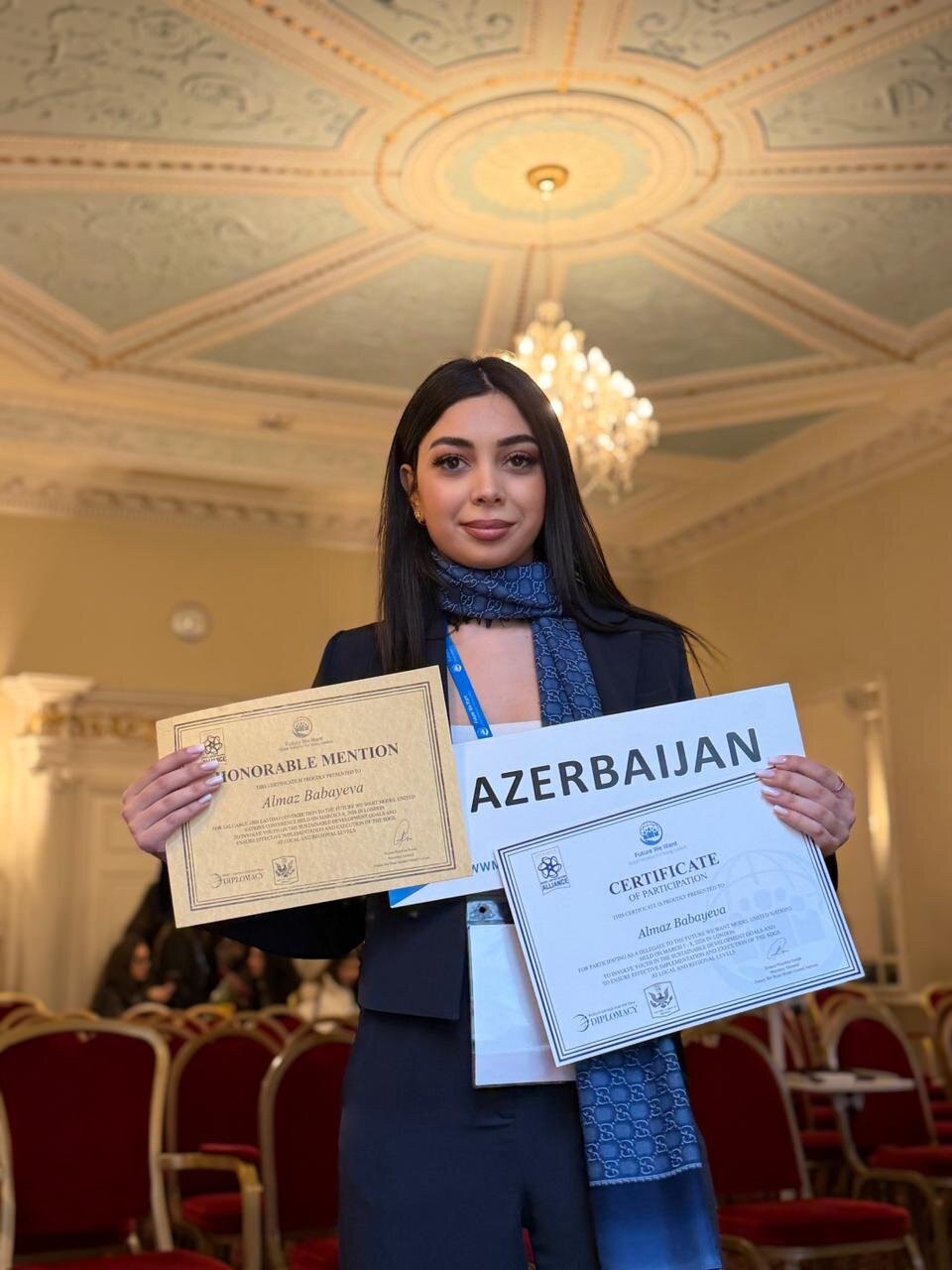 Almaz Babayeva konfrans zamanı diplomatik müzakirələrdə aktiv iştirak edib, layihələrdə uğurlu çıxışlar göstərib və beynəlxalq səviyyədə tanınan bu mükafatı qazanıb. Sertifikat onun gənclərin SDG-lərə cəlb olunması və qlobal əməkdaşlıq sahəsindəki xidmətlərinə görə verilib.