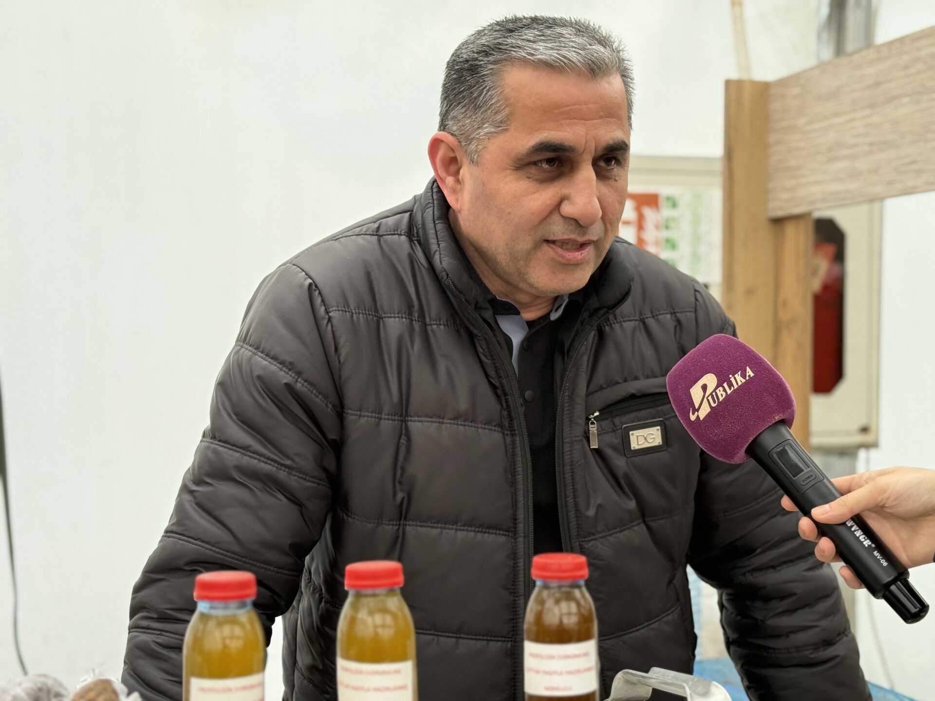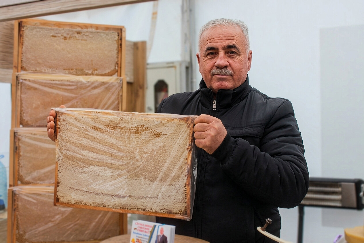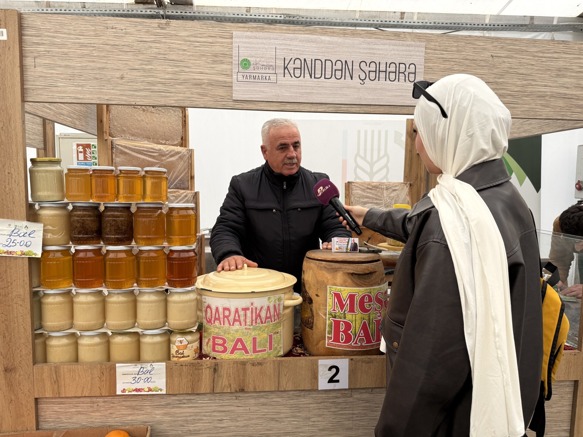 İlk olaraq, yarmarkanın girişində təqdim olunan bal piştaxtasına yaxınlaşdıq. Arıçı fermer Qəhrəman İbrahimov bildirdi ki, hər il yarmarkada iştirak edərək, alıcılara bir neçə çeşiddə bal təqdim edir: