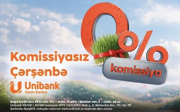 Publika.az xəbər verir ki, bayramla əlaqədar Bank 3 günlük komissiyasız kredit aksiyası keçirir. Martın 17-dən 19-dək “Unibank”dan kredit rəsmiləşdirən hər kəs nağd krediti 0 % komissiya ilə əldə edəcək.