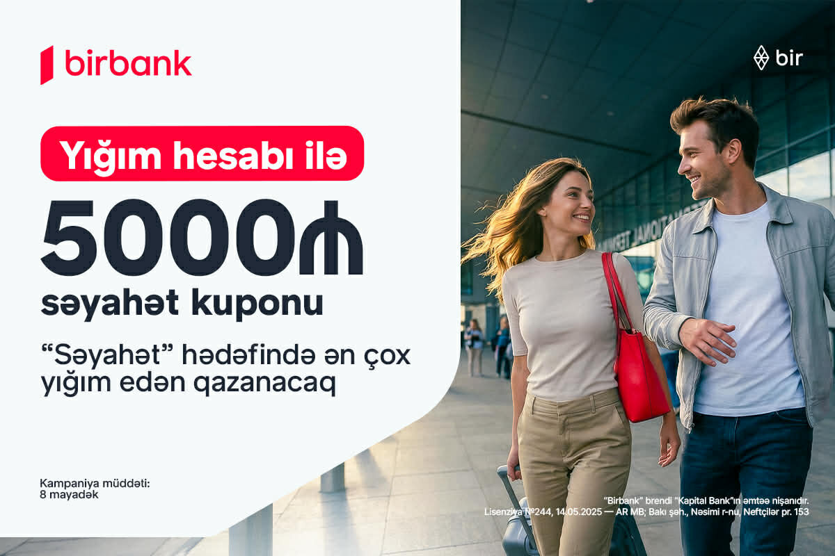Ölkənin ilk rəqəmsal bankı Birbank müştəriləri üçün “Səyahət marafonu” kampaniyasına start verib. 08 aprel - 08 may 2026-cı il tarixlərini əhatə edən kampaniya Birbanklılara yığım edərək dəyərli hədiyyələr qazanmaq imkanı yaradır. Kampaniya çərçivəsində Birbank tətbiqində “Səyahət” hədəfini seçərək ən yüksək məbləği toplayan 1 nəfərə 5 000 AZN dəyərində, növbəti 6 iştirakçıya isə hər biri 500 AZN dəyərində olmaqla səyahət kuponu təqdim olunacaq.