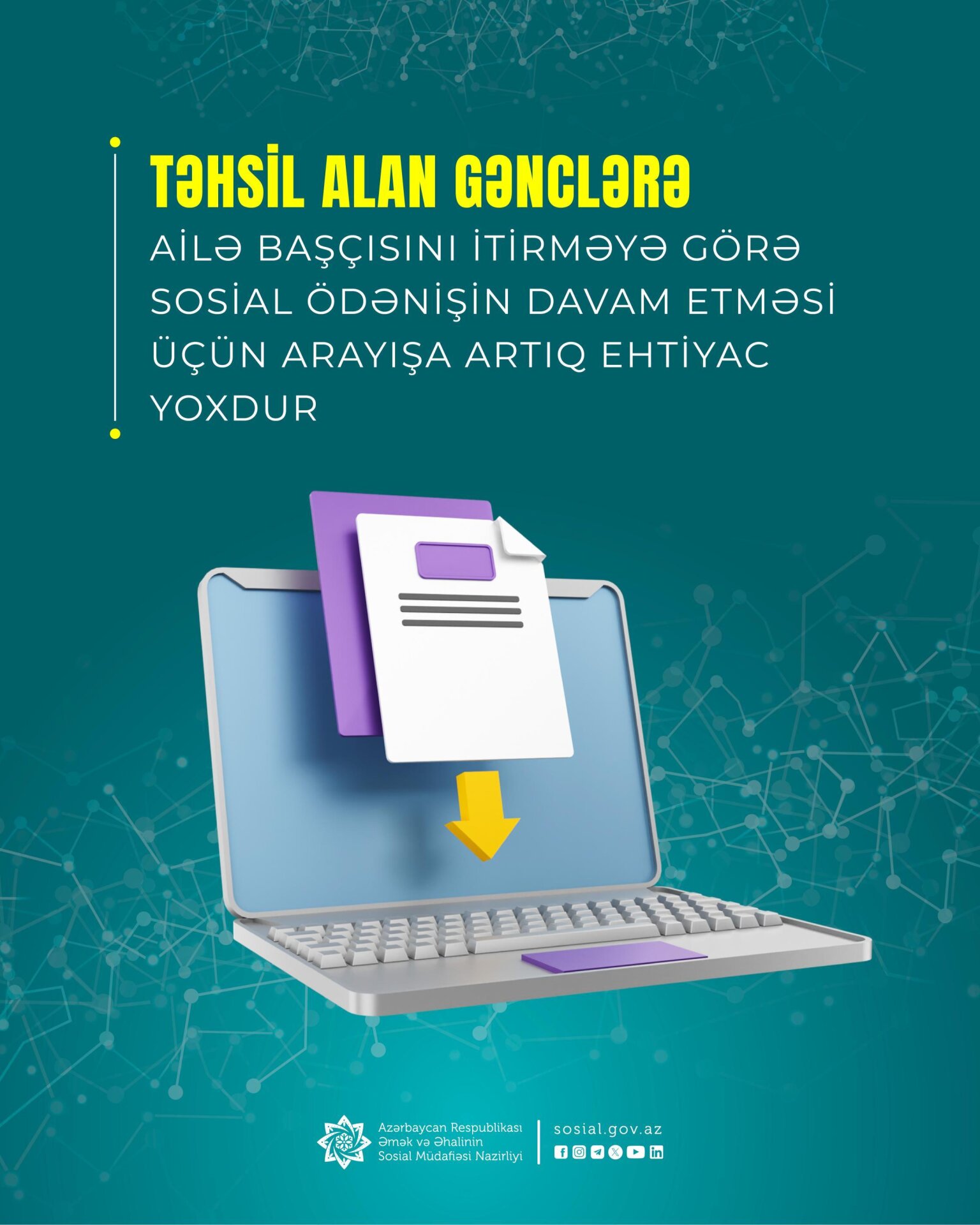 Vəfat etmiş və ya həlak olmuş şəxslərin ölkə daxilində əyani təhsil alan 23 yaşadək övladlarının əyani təhsil almaları barədə məlumatlar Dövlət İmtahan Mərkəzinin “Tələbə-Məzun” informasiya bazasından e-qaydada əldə olunur. Bununla da qeyd edilən ödənişin davam etdirilməsi prosesi avtomatik təmin edilir.