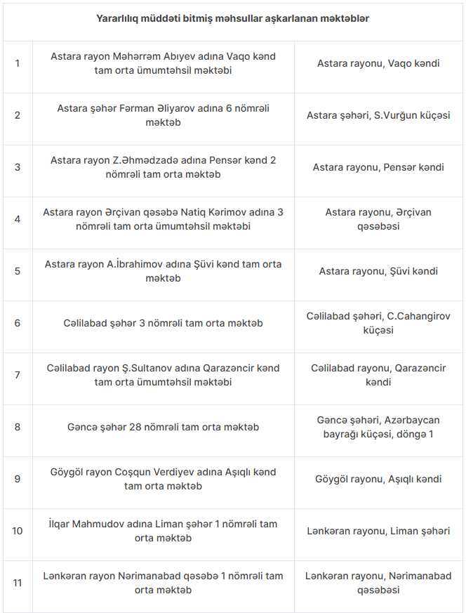“Eyni zamanda 23 məktəbdə yararlılıq müddəti bitmiş, 5 məktəbdə isə bufetdə satılması qadağan edilən məhsullar aşkarlanıb. Yararlılıq müddəti bitmiş və satılması qadağan edilmiş məhsullar dərhal satışdan kənarlaşdırılıb. Aşkar olunmuş uyğunsuzluqlarla bağlı məsul şəxslər barəsində inzibati tədbir görülüb, icrası məcburi göstərişlər verilib. Eyni zamanda, məsələnin ciddi şəkildə nəzarətə götürülməsi üçün Elm və Təhsil Nazirliyinə və regional təhsil idarələrinə məktublar ünvanlanıb.