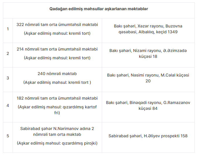 Nazirlər Kabinetinin 171 saylı müvafiq qərarına əsasən, ümumtəhsil müəssisələrində şagirdlərin qidalanması zamanı istifadə olunması qadağan edilən məhsulların siyahısı müəyyən edilib. Qanunvericiliklə bu tip müəssisələrdə istehlaka təqdim edilməsi qadağan olunmuş və yararlılıq müddəti bitmiş məhsulların uşaqlara satılmasına yol verilmir. Məktəblərin qida blokunun sanitar-texniki və sanitar-gigiyenik vəziyyəti, istehlaka verilən qida məhsullarının minimum keyfiyyət və təhlükəsizlik göstəriciləri də tələblərə uyğun olmalıdır” , - məlumatda vurğulanıb.