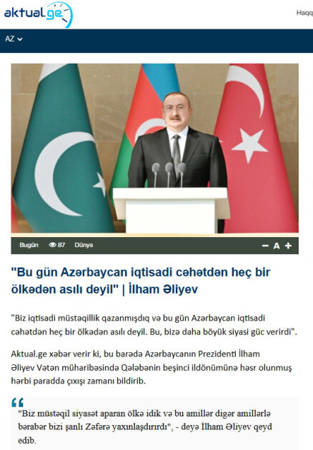 Gürcüstanın nüfuzlu 1tv.ge, 24news.ge, aktual.ge, interpress.ge portalları Azərbaycanda Vətən Müharibəsində Qələbənin 5-ci ildönümü ilə bağlı təşkil olunan Hərbi parad və bayramla bağlı xəbərlər yayıblar.