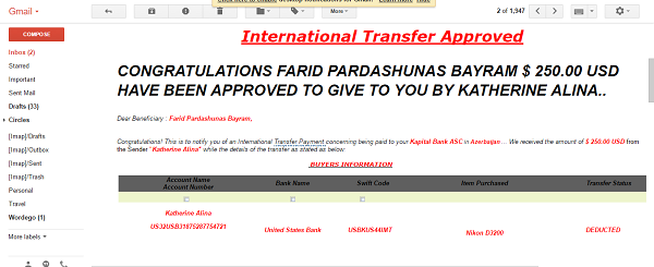 Bunun qarşılığında bizə 250$ ödəyəcəyini bildirən bu saxtakar Azərbaycanda Ramazan bayramının olduğunu və əməliyyatları iş günü icra edəcəyini bizə bildirdi. Nigeriyada işlənmiş fototexnika mağazalarının olduğunu vurğulayan Lisa bizdən Azərbaycandan daha çox avadanlıq göndərməyimizi və bunu daimi əməkdaşlıq səviyyəsində icra etməyimizi istəyirdi. Əvvəl PayPal üzərindən ödəniş etmək istədiyini deyən xanıma vəziyyəti başa saldıq ki, bəs Azərbaycanda PayPal ödənişi qəbul etmək mümkün deyil. Elə isə ya bank ya da sürətli köçürülmə yolu ilə bu alış-veriş baş tutmalı və məhsul AzerExpress POÇT (EMS) vasitəsilə Nigeriya-ya göndərilməli idi. Gün gəlib əməliyyat hissəsinə çatdı və bizim şirkətin bank rekvizitlərini qarşı tərəflə bölüşdüm. Bir neçə dəqiqə sonra UnitedStateBankTransfers-dən ödəniş edilməsi ilə bağlı rəsmi bildiriş email ünvanıma gəldi. Mail aşağıdakı kimidir.